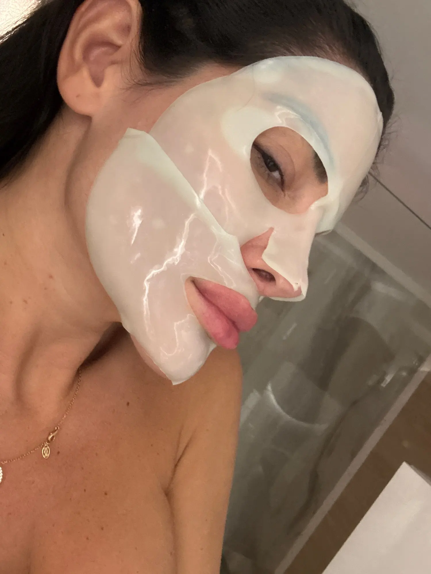 Don’t waste the eyes and mouth parts of the mask. Apply them on the sides of the nose, under your eyes, neck, or anywhere you want additional hydration and firming.